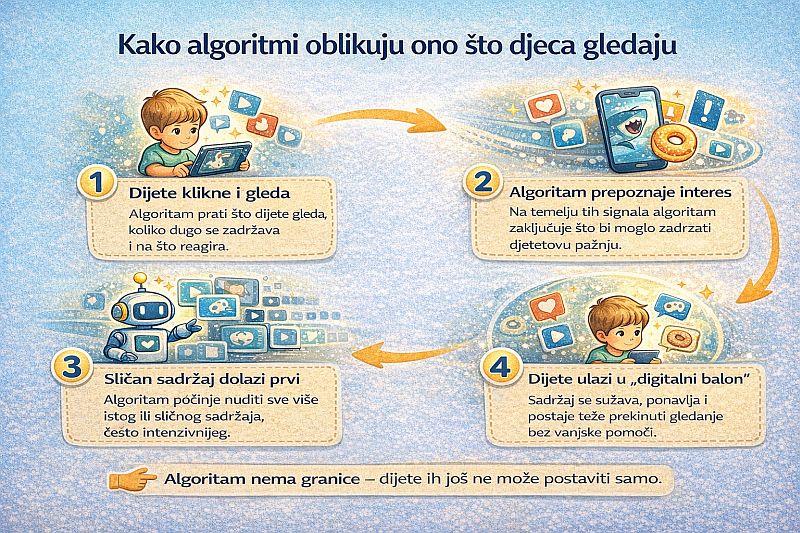 Djeca vrlo brzo ostavljaju jasan digitalni trag. Dovoljno je nekoliko klikova ili nekoliko sekundi duljeg gledanja da algoritam zaključi što bi moglo zadržati njihovu pažnju. Tako se stvara svojevrsni digitalni balon u kojem se isti tip sadržaja stalno ponavlja. Dijete ima osjećaj da stalno otkriva nešto novo, ali zapravo se kreće unutar vrlo uskog kruga preporuka.