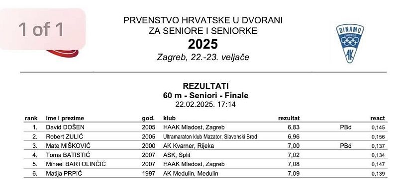Robert je u svojoj skupini osvojio prvo mjesto s rezultatom 6.96 sek., što mu je donijelo ulazak u finale. U finalu koje je uslijedilo sat vremena nakon kvalifikacija ponovio je isti rezultat 6.96 sek. te osvojio drugo mjesto na 60 metara. Prvi je bio David Došen iz HAAK Mladost s rezultatom 6.83 sek., a treće mjesto je osvojio Mate Mišković iz AK Kvarner s rezultatom 7:00 sek.