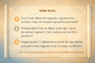 Online igre nisu dizajnirane slučajno. Nagrade postoje s jasnim ciljem – da se igrač vrati. Djeca su na to posebno osjetljiva jer još nemaju razvijene mehanizme samokontrole. Roditeljska uloga nije borba protiv igara, nego pomoć djetetu da razumije kako one funkcioniraju. Kada dijete shvati da nagrada nije obaveza, a roditelj postavi jasne i razumljive granice, ekran prestaje biti stalni izvor sukoba.