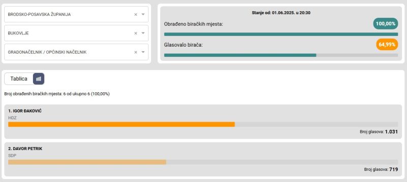 Odaziv birača na birališta u drgome krugu lokalnih izbora među najslabijim je upravo u Brodsko-posavskoj županiji, tek nešto više od 25 posto. U gradu Slavonskom Brodu u drugom je krugu glasovalo 30,31 posto. U općini Gornji Bogićevci glasovalo je 43,73 posto birača, u općini Bebrina izlaznost je 51, 41 posto, u općini Garčin 53,35 posto, a u općini Bukovlje najviše - gotovo 65 posto.