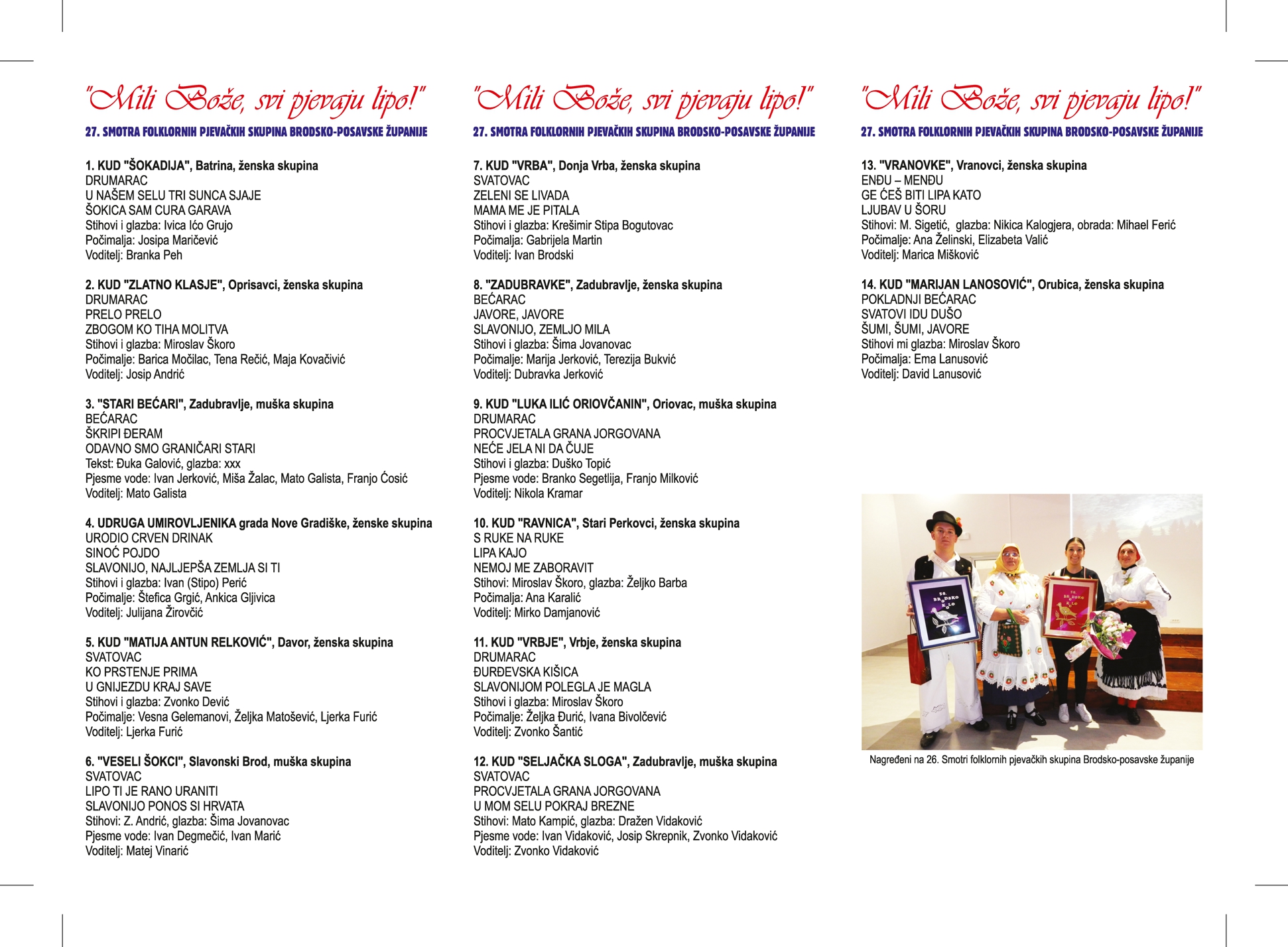 Smotra će se ove godine održati u Cerniku uz suorganiziranje KUU „CERNIK“, koji će ovaj program organizirati sa glavnim organizatorima svih programa Brodskog kola, Folklornim ansamblom Broda. Članovi programskog odbora Brodskog kola su ovome programu odredili ime „Mili Bože, svi pjevaju lipo!“, a također je određeno i dogovoreno da će biti nagrađena najbolja počimalja i najbolji počimać na ovoj smotri, prosudbeno povjerenstvo će izabrati pet najkvalitetnijih skupina koje će Brodsko-posavsku županiju predstavljati na regionalnoj smotri pjevačkih skupina Slavonije Baranje i Srijema „Alaj pjevam i pjevati znadem“, te jednu skupinu koja će predstaviti našu županiju na državnoj smotri u Koprivnici.