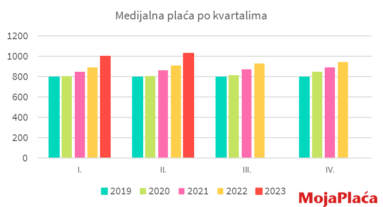 Medijan* plaće je nešto niži i iznosi 1.030 eura, što znači da većina radnika ima manju plaću od navedenog prosjeka. U odnosu na prošli kvartal medijalna plaća narasla je 3%, a u odnosu na prvi kvartal prošle godine 13%.