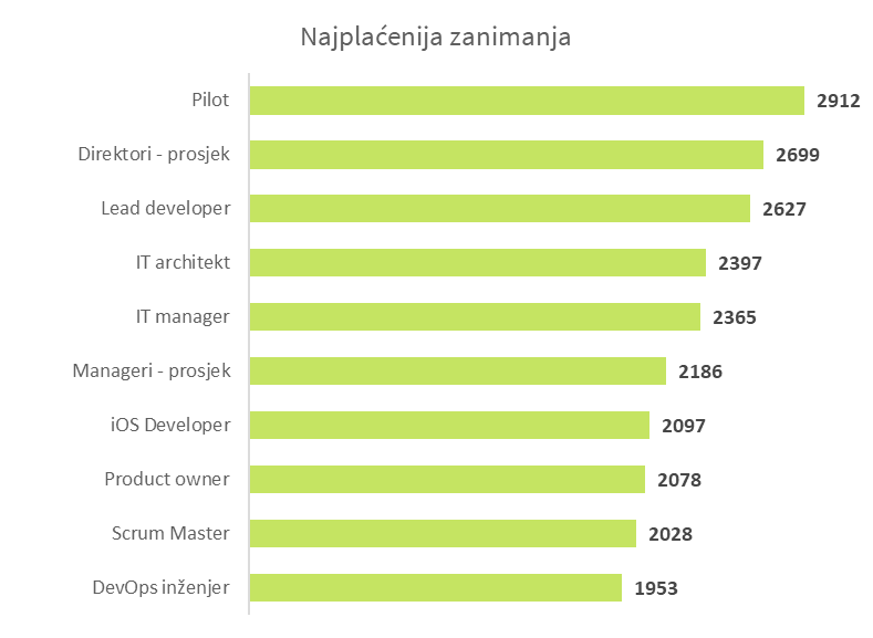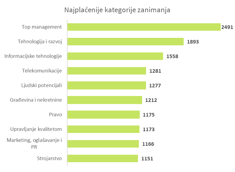 Osim menadžerskih zanimanja, gdje su plaće u prosjeku 119% više od prosječne, najplaćenija zanimanja su i dalje ona iz područja tehnologije i razvoja (66% više od prosjeka) i informacijskih tehnologija (+37%).
