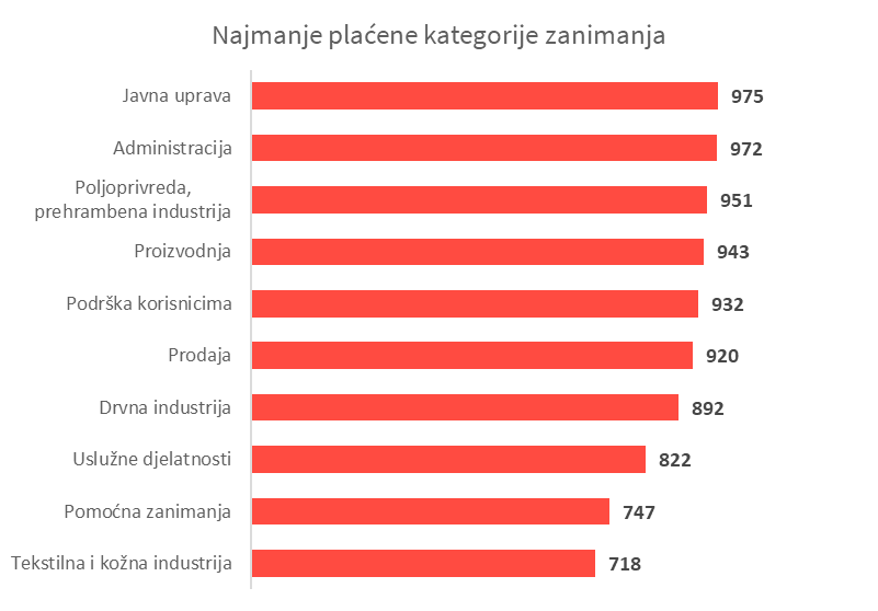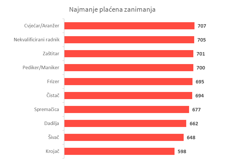 Najmanje prosječne plaće u Hrvatskoj imaju radnici u pomoćnim zanimanjima (-34%), tekstilni radnici (-37%) te zaposleni u uslužnim djelatnostima (-28%).
