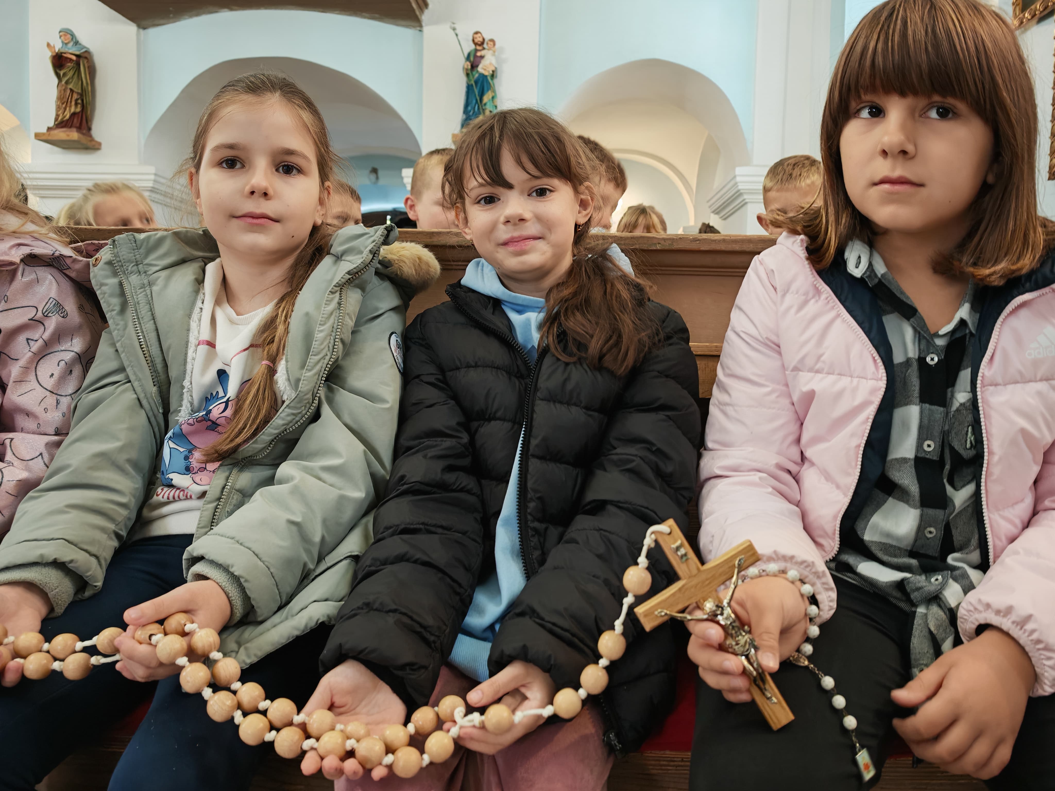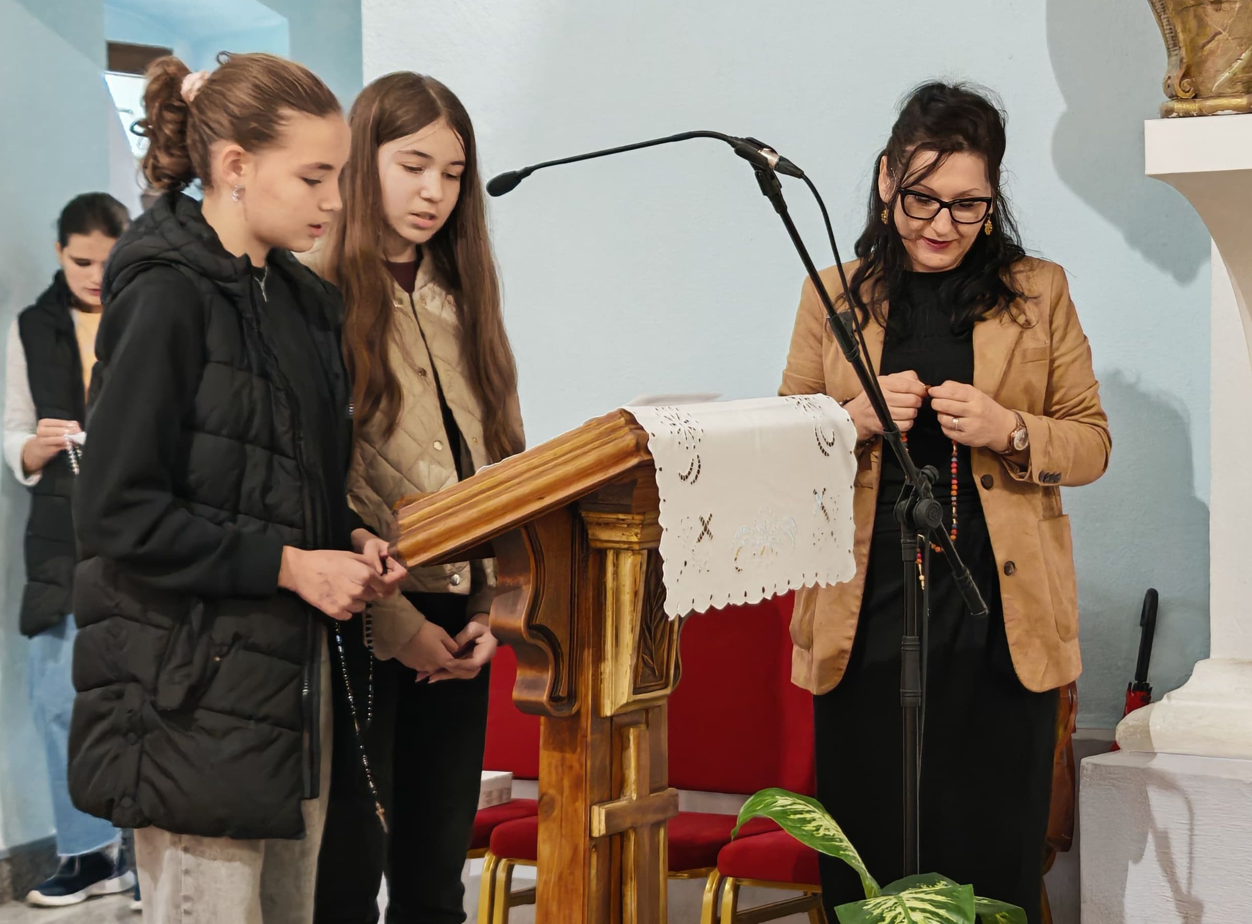 Dok su dječica radosno prebirala zrnca krunice djevojčice različitih osnovnoškolskih uzrasta predmolile su slavna otajstva Gospine krunice, a potom su svi u glas izmolili i Dječju posvetnu molitvu Majci Božjoj kako bi se svi zajedno zaogrnuli Njezinim plaštem i preporučili Njezinu moćnu zagovoru.