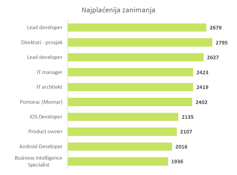 Osim menadžerskih zanimanja, gdje su plaće u prosjeku 126% više od prosječne, najplaćenija zanimanja su i dalje ona iz područja tehnologije i razvoja (34% više od prosjeka).