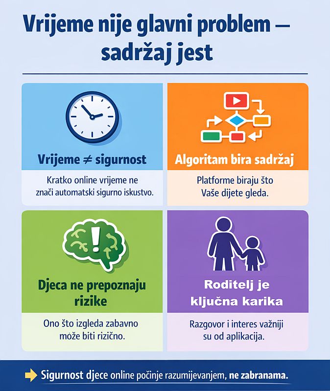 Zašto samo trajanje nije dobar pokazatelj? Zato što današnje digitalne platforme same biraju sadržaj za dijete. Video slijedi video, preporuka vuče preporuku – algoritam je osmišljen da zadrži pažnju što dulje, ne mareći za uzrast ili dobrobit vašeg djeteta. Dijete može započeti s potpuno bezazlenim videom, a kroz nekoliko klikova ili automatskih prijedloga završiti na sadržaju koji nije primjeren njegovoj dobi. U takvom okruženju i 15 minuta može biti dovoljno da naiđe na nešto uznemirujuće, dok sat vremena kvalitetne, vođene online aktivnosti ne mora predstavljati nikakav problem.
